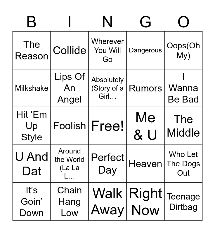 This bingo card has a free space and 42 words: Faded, Absolutely (Story of a Girl…, Butterfly, Around the World (La La L…, Right Now, Who Let The Dogs Out, Teenage Dirtbag, My Baby, Wherever You Will Go, Perfect Day, The Middle, I Wanna Be Bad, Foolish, Oops(Oh My), A Thousand Miles, Heaven, Stacy’s Mom, Hit ‘Em Up Style, White Flag, Collide, Milkshake, Tipsy, Move Ya Body, The Reason, 1985, Let Me Love You, Rumors, Hey There Delilah, Bad Day, Wait, Laffy Taffy, U And Dat, Lips Of An Angel, Walk Away, Chasing Cars, It’s Goin’ Down, Chain Hang Low, Me & U, This Is Why I’m Hot, Paralyzer, Dangerous and Headstrong.