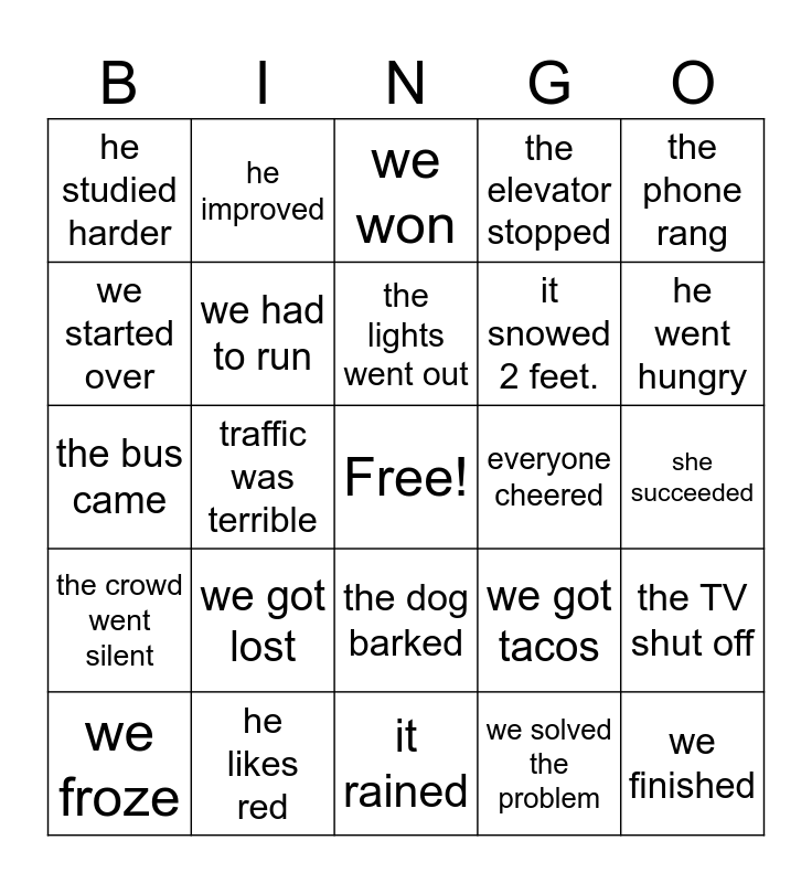 This bingo card has a free space and 24 words: we got lost, he likes red, the lights went out, we froze, the phone rang, he studied harder, we started over, he improved, everyone cheered, the dog barked, it snowed 2 feet., the bus came, we got tacos, the TV shut off, we had to run, we solved the problem, she succeeded, we won, he went hungry, traffic was terrible, we finished, the crowd went silent, the elevator stopped and it rained.