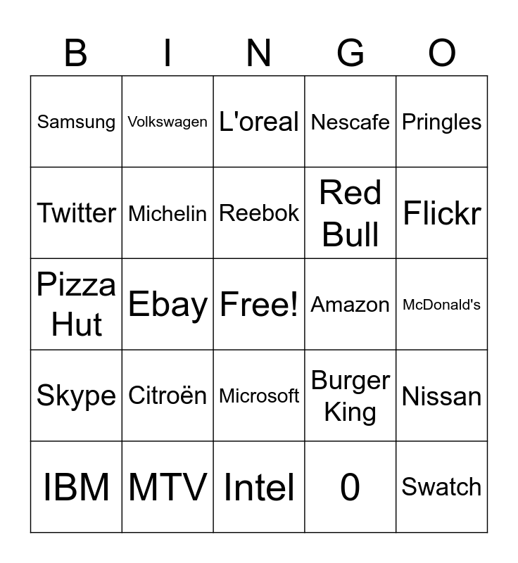 This bingo card has a free space and 30 words: MTV, 0, Ebay, Sap, Samsung, L'oreal, Michelin, Microsoft, Amazon, Intel, McDonald's, Swatch, 0, 0, Flickr, 0, Burger King, Skype, Citroën, Pringles, Pizza Hut, 0, Volkswagen, Red Bull, Twitter, Nescafe, Nissan, IBM, Reebok and 0.