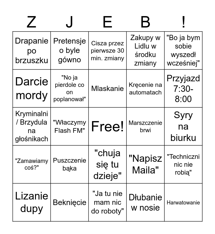 This bingo card has a free space and 24 words: Puszczenie bąka, Beknięcie, Mlaskanie, Lizanie dupy, "Bo ja bym sobie wyszedł wcześniej", Drapanie po brzuszku, Darcie mordy, Pretensje o byle gówno, Marszczenie brwi, "chuja się tu dzieje", Kręcenie na automatach, Kryminalni / Brzydula na głośnikach, "Napisz Maila", "Techniczni nic nie robią", "No ja pierdole co on poplanował", Dłubanie w nosie, Syry na biurku, Cisza przez pierwsze 30 min. zmiany, Przyjazd 7:30-8:00, "Właczymy Flash FM", Harwatowanie, "Zamawiamy coś?", Zakupy w Lidlu w środku zmiany and "Ja tu nie mam nic do roboty".