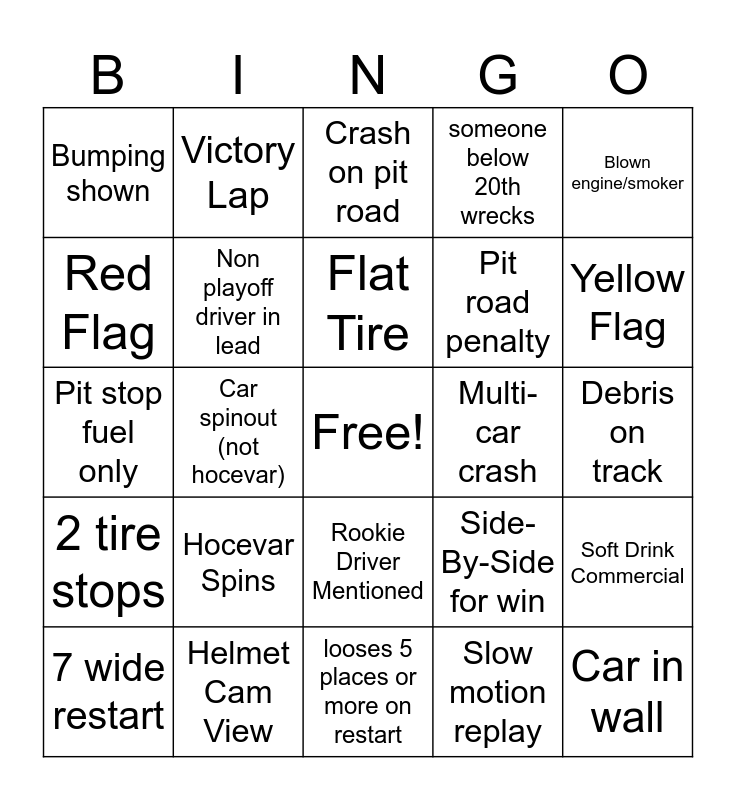 This bingo card has a free space and 24 words: Hocevar Spins, Helmet Cam View, Flat Tire, 7 wide restart, Blown engine/smoker, Bumping shown, Red Flag, Victory Lap, Multi-car crash, Rookie Driver Mentioned, Pit road penalty, Pit stop fuel only, Side-By-Side for win, Soft Drink Commercial, Non playoff driver in lead, Slow motion replay, Debris on track, Crash on pit road, Yellow Flag, Car spinout (not hocevar), Car in wall, 2 tire stops, someone below 20th wrecks and looses 5 places or more on restart.