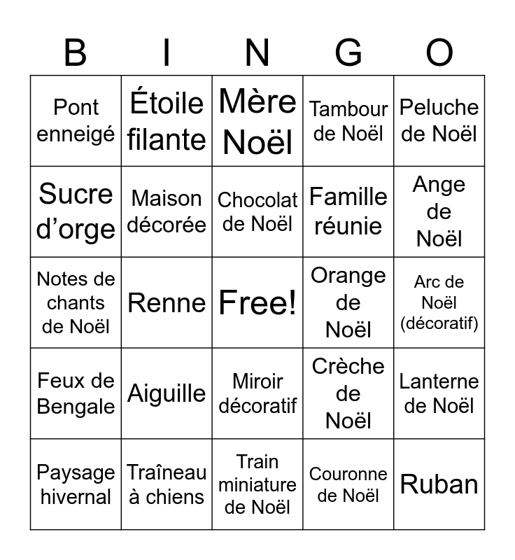 This bingo card has a free space and 75 words: I’m Sapin de Noël, Père Noël, Mère Noël, Bonhomme de neige, Flocon de neige, Étoile de Noël, Cadeau emballé, Chaussette de Noël, Cloche de Noël, Bougie de Noël, Tarte de Noël, Biscuit de Noël, Chocolat de Noël, Sucre d’orge, Traîneau, Renne, Sapin, Ruban, Écharpe de Noël, Peluche de Noël, Flûte de champagne, Notes de chants de Noël, Maison décorée, Étoile filante, Tambour de Noël, Chanson de Noël, Colombe de Noël, Boule de Noël décorée, Vin chaud, Chocolat chaud, Maison en pain d’épices, Bûche de Noël, Advent, Crèche de Noël, Ange de Noël, Famille réunie, Feu d’artifice de Noël, Célébration, Arc de Noël (décoratif), Couronne de Noël, Sac de cadeaux, Carrousel de Noël, Patin à glace, Ski, Snowboard, Montagne enneigée, Paysage hivernal, Pont enneigé, Cabane de Noël, Billet pour Noël, Lampe décorative, Miroir décoratif, Nœud décoratif, Sonnette de Noël, Puzzle de Noël, Pinceau pour décorations, Crayon pour cartes, Livre de contes de Noël, Bobine de fil décoratif, Pelote de laine, Aiguille, Guirlande, Sapin miniature, Poinsettia, Pomme décorative, Orange de Noël, Noix, Piñata de Noël, Gui, Lanterne de Noël, Feux de Bengale, Traîneau à chiens, Bonhomme de neige, Train miniature de Noël and Nuit étoilée de Noël.
