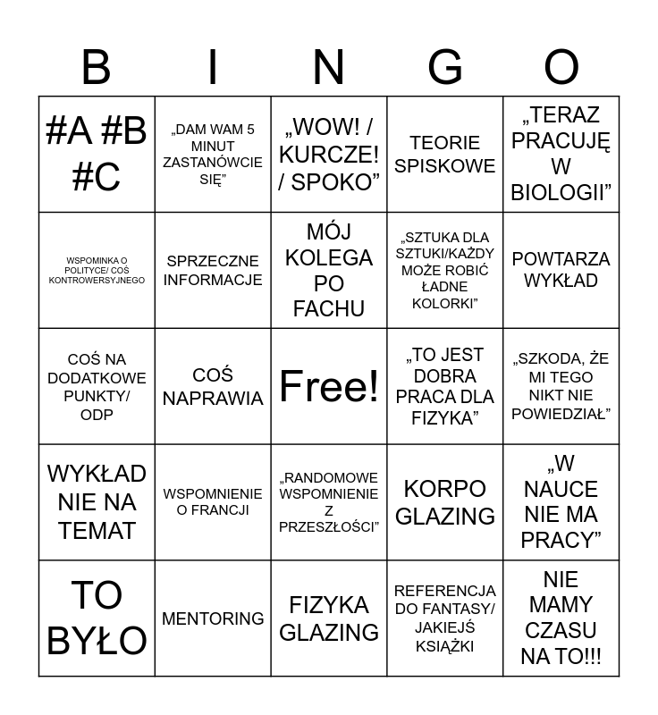 This bingo card has a free space and 24 words: WSPOMNIENIE O FRANCJI, MENTORING, MÓJ KOLEGA PO FACHU, TO BYŁO, „TERAZ PRACUJĘ W BIOLOGII”, #A #B #C, WSPOMINKA O POLITYCE/ COŚ KONTROWERSYJNEGO, „DAM WAM 5 MINUT ZASTANÓWCIE SIĘ”, „TO JEST DOBRA PRACA DLA FIZYKA”, „RANDOMOWE WSPOMNIENIE Z PRZESZŁOŚCI”, „SZTUKA DLA SZTUKI/KAŻDY MOŻE ROBIĆ ŁADNE KOLORKI”, COŚ NA DODATKOWE PUNKTY/ ODP, KORPO GLAZING, „W NAUCE NIE MA PRACY”, SPRZECZNE INFORMACJE, REFERENCJA DO FANTASY/ JAKIEJŚ KSIĄŻKI, „SZKODA, ŻE MI TEGO NIKT NIE POWIEDZIAŁ”, „WOW! / KURCZE! / SPOKO”, POWTARZA WYKŁAD, COŚ NAPRAWIA, NIE MAMY CZASU NA TO!!!, WYKŁAD NIE NA TEMAT, TEORIE SPISKOWE and FIZYKA GLAZING.