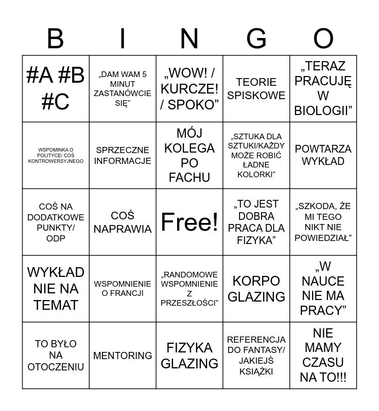 This bingo card has a free space and 24 words: WSPOMNIENIE O FRANCJI, MENTORING, MÓJ KOLEGA PO FACHU, TO BYŁO NA OTOCZENIU, „TERAZ PRACUJĘ W BIOLOGII”, #A #B #C, WSPOMINKA O POLITYCE/ COŚ KONTROWERSYJNEGO, „DAM WAM 5 MINUT ZASTANÓWCIE SIĘ”, „TO JEST DOBRA PRACA DLA FIZYKA”, „RANDOMOWE WSPOMNIENIE Z PRZESZŁOŚCI”, „SZTUKA DLA SZTUKI/KAŻDY MOŻE ROBIĆ ŁADNE KOLORKI”, COŚ NA DODATKOWE PUNKTY/ ODP, KORPO GLAZING, „W NAUCE NIE MA PRACY”, SPRZECZNE INFORMACJE, REFERENCJA DO FANTASY/ JAKIEJŚ KSIĄŻKI, „SZKODA, ŻE MI TEGO NIKT NIE POWIEDZIAŁ”, „WOW! / KURCZE! / SPOKO”, POWTARZA WYKŁAD, COŚ NAPRAWIA, NIE MAMY CZASU NA TO!!!, WYKŁAD NIE NA TEMAT, TEORIE SPISKOWE and FIZYKA GLAZING.