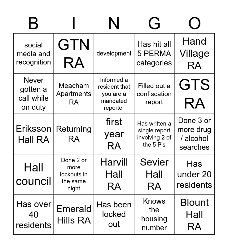 This bingo card has 30 words: Emerald Hills RA, Knows the number for campus police, Returning RA, Castle Heights RA, social media and recognition, development, Meacham Apartments RA, Harvill Hall RA, Has written a single report involving 2 of the 5 P's, Has been locked out, Done 3 or more drug / alcohol searches, first year RA, Knows the housing number, Blount Hall RA, GTS RA, Senior Staff member, Sevier Hall RA, Hall council, Done 2 or more lockouts in the same night, Hand Village RA, Eriksson Hall RA, campus wide engagement, GTN RA, Filled out a confiscation report, Never gotten a call while on duty, Has hit all 5 PERMA categories, Has under 20 residents, Has over 40 residents, Informed a resident that you are a mandated reporter and Has had a parent call the duty phone.