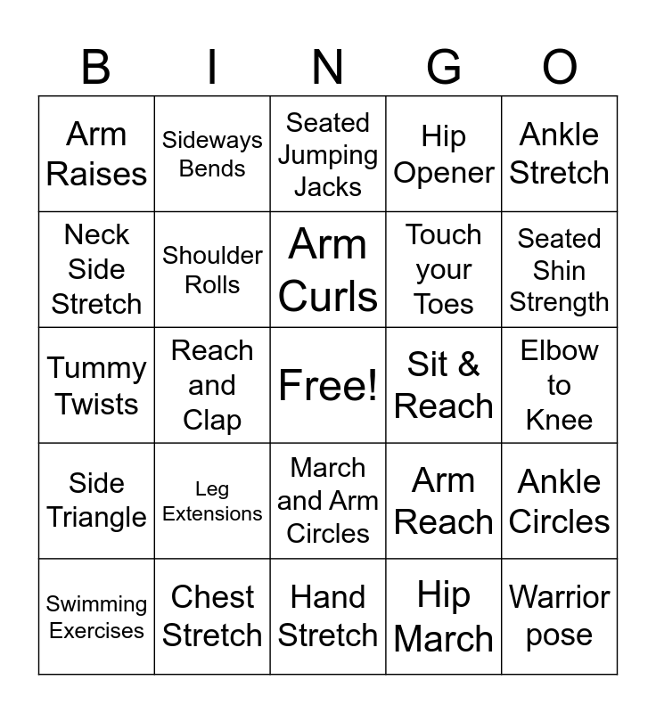 This bingo card has a free space and 24 words: Swimming Exercises, Leg Extensions, Arm Curls, Hip March, Ankle Stretch, Arm Raises, Sideways Bends, Seated Jumping Jacks, Sit & Reach, Elbow to Knee, Tummy Twists, Shoulder Rolls, Arm Reach, Ankle Circles, Neck Side Stretch, Chest Stretch, Hand Stretch, Hip Opener, Seated Shin Strength, Side Triangle, Reach and Clap, March and Arm Circles, Touch your Toes and Warrior pose.