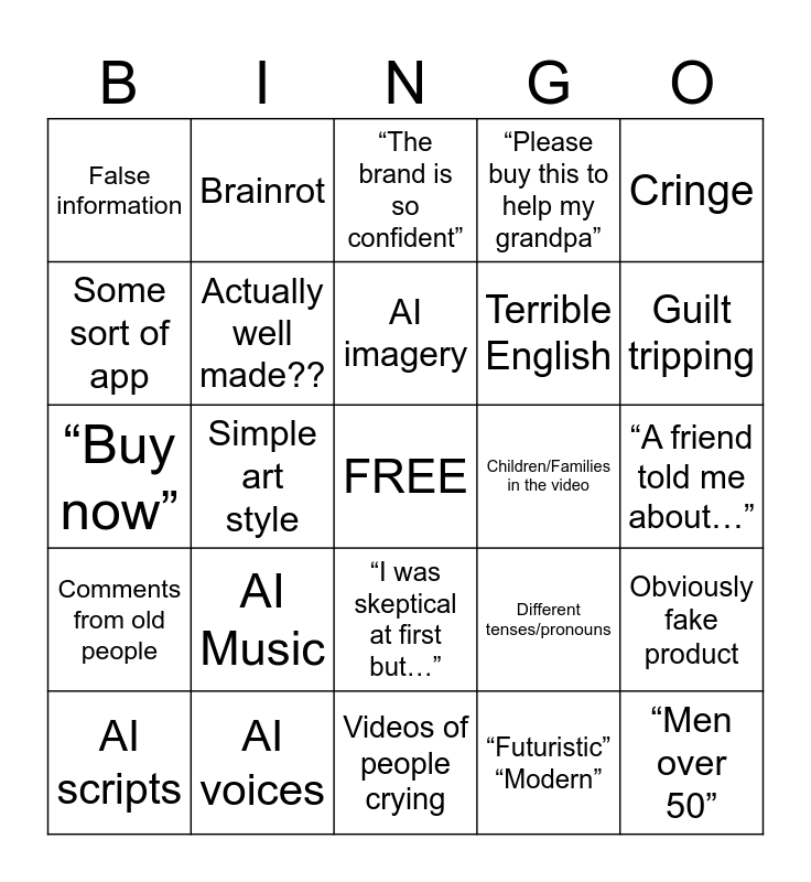 This bingo card has a free space and 24 words: AI Music, AI voices, AI imagery, AI scripts, Cringe, False information, Some sort of app, Brainrot, Children/Families in the video, “I was skeptical at first but…”, Terrible English, “Buy now”, Different tenses/pronouns, Obviously fake product, Actually well made??, “Futuristic” “Modern”, “A friend told me about…”, “The brand is so confident”, Guilt tripping, Simple art style, “Men over 50”, Comments from old people, “Please buy this to help my grandpa” and Videos of people crying.