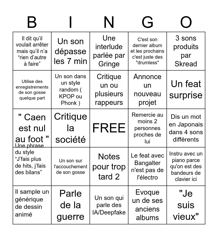 This bingo card has a free space and 24 words: Un son sur l'accouchement de son gosse, Parle de la guerre, Critique un ou plusieurs rappeurs, Il sample un générique de dessin animé, 3 sons produits par Skread, Il dit qu’il voulait arrêter mais qu’il n’a “rien d’autre à faire”, Utilise des enregistrements de son gosse quelque part, Un son dépasse les 7 min, Remercie au moins 2 personnes proches de lui, Notes pour trop tard 2, Annonce un nouveau projet, " Caen est nul au foot ", Le feat avec Bangalter n'est pas de l'électro, Instru avec un piano parce qu'on est des bandeurs de clavier ici, Un son dans un style random ( KPOP ou Phonk ), Evoque un de ses anciens albums, Dis un mot en Japonais dans 4 sons différents, Une interlude parlée par Gringe, Un feat surprise, Critique la société, "Je suis vieux", Une phrase du style “J’fais plus de hits, j’fais des bilans”, C'est son dernier album et les prochains c'est juste des "drumless" and Un son qui parle des IA/Deepfake.