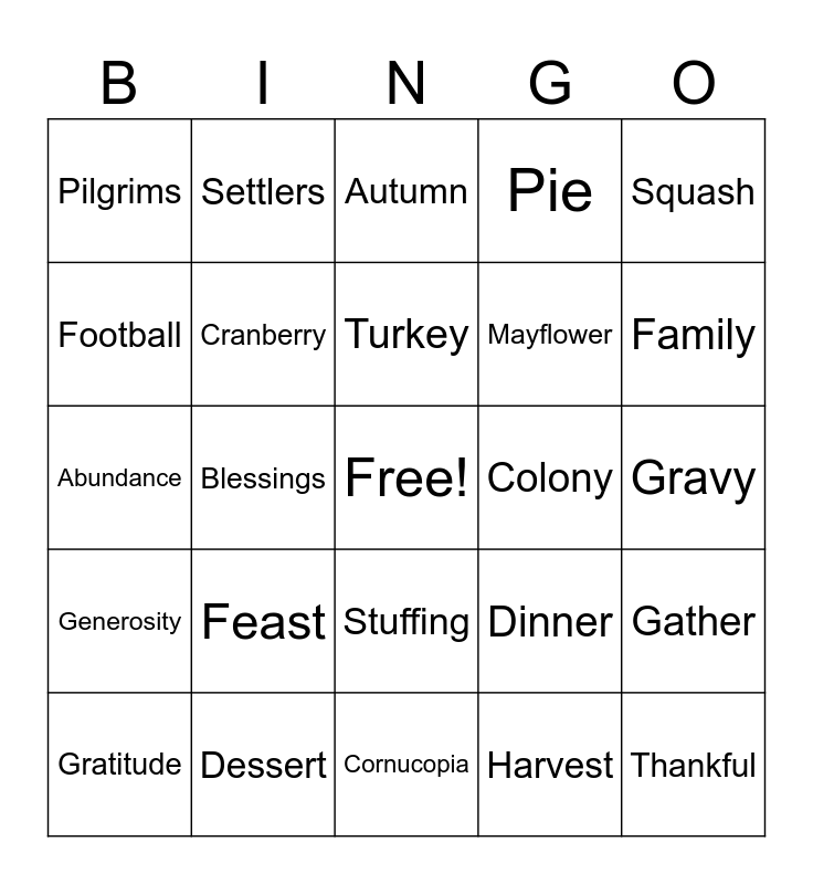 This bingo card has a free space and 25 words: Gratitude, Feast, Turkey, Harvest, Family, Pilgrims, Settlers, Autumn, Mayflower, Gather, Abundance, Cranberry, Dinner, Thankful, Football, Dessert, Cornucopia, Pie, Gravy, Generosity, Blessings, Stuffing, Colony, Squash and Acorns.