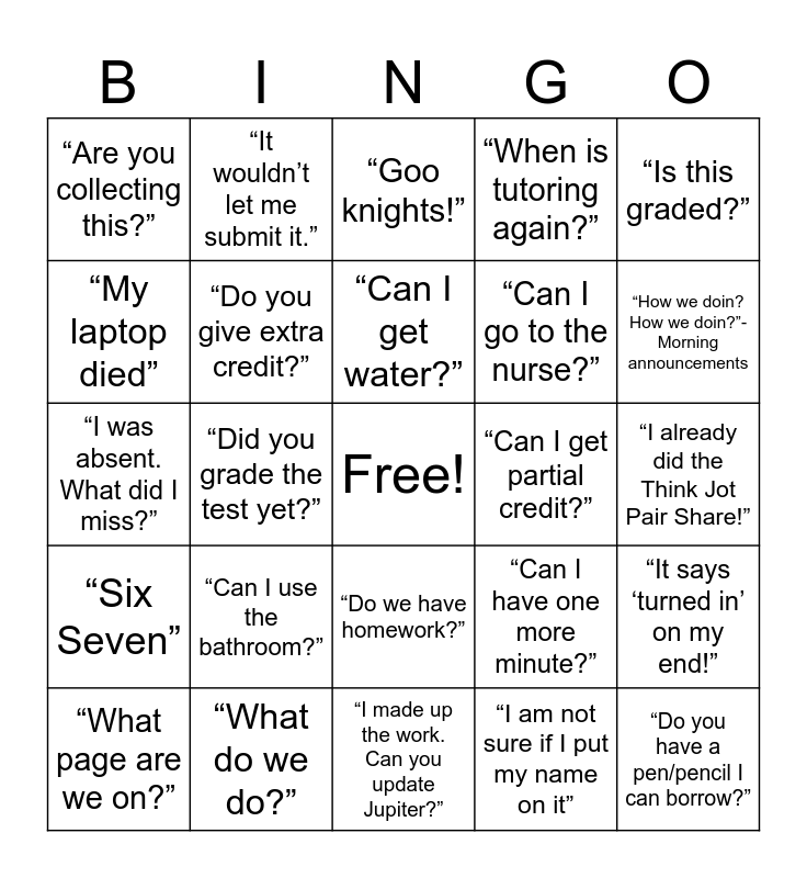 This bingo card has a free space and 24 words: “Can I use the bathroom?”, “What do we do?”, “Can I get water?”, “What page are we on?”, “Is this graded?”, “Are you collecting this?”, “My laptop died”, “It wouldn’t let me submit it.”, “Can I get partial credit?”, “Do we have homework?”, “Can I go to the nurse?”, “I was absent. What did I miss?”, “Can I have one more minute?”, “It says ‘turned in’ on my end!”, “Do you give extra credit?”, “I am not sure if I put my name on it”, “I already did the Think Jot Pair Share!”, “Goo knights!”, “How we doin? How we doin?”- Morning announcements, “Did you grade the test yet?”, “Do you have a pen/pencil I can borrow?”, “Six Seven”, “When is tutoring again?” and “I made up the work. Can you update Jupiter?”.