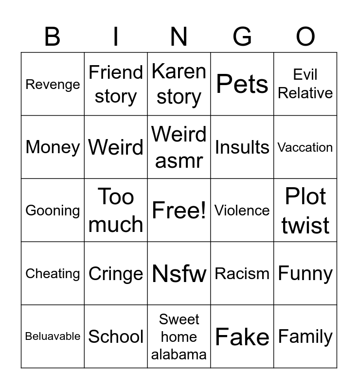 This bingo card has a free space and 24 words: Cringe, School, Weird asmr, Beluavable, Evil Relative, Revenge, Money, Friend story, Violence, Nsfw, Insults, Gooning, Racism, Funny, Weird, Fake, Plot twist, Karen story, Vaccation, Too much, Family, Cheating, Pets and Sweet home alabama.