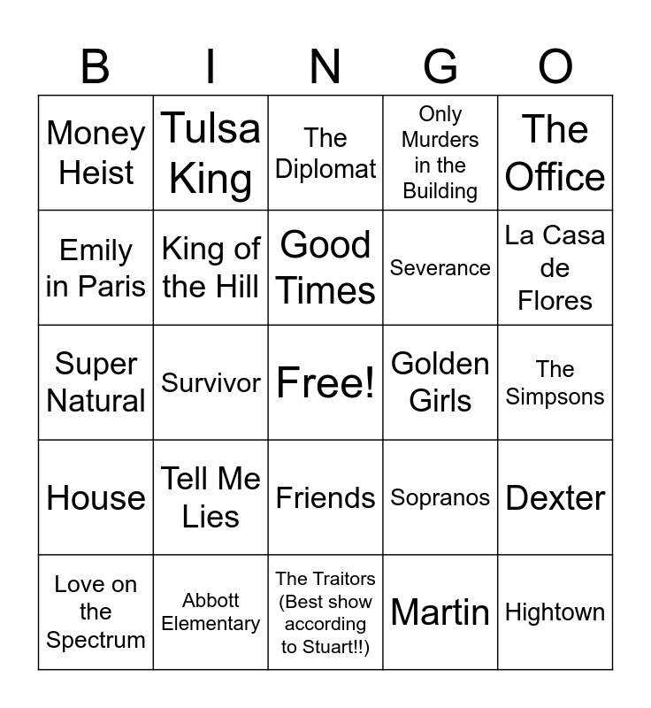 This bingo card has a free space and 33 words: Ted Lasso, I Love Lucy, Survivor, Game of Thrones, House, King of the Hill, The Office, Love on the Spectrum, Tulsa King, 30 Rock, Good Times, The Diplomat, Breaking Bad, Kitchen Nightmares, Golden Girls, La Casa de Flores, Abbott Elementary, Super Natural, Tell Me Lies, Sopranos, Friends, Seinfeld, Money Heist, The Simpsons, The Traitors (Best show according to Stuart!!), Hightown, Only Murders in the Building, Severance, Emily in Paris, Dexter, Stranger Things, Martin and The West Wing.