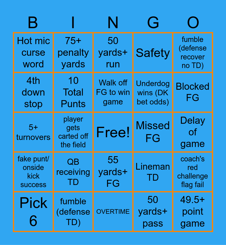 This bingo card has a free space and 43 words: Chris Collinsworth says "Patrick Mahomes" (Chiefs no play), 49.5+ point game, INT no TD, Pick 6, Special Teams, 50 yards+ pass, 50 yards+ run, fumble (offense recover), fumble (defense recover no TD), fumble (defense TD), Safety, Missed FG, 55 yards+ FG, QB receiving TD, player ejection, OVERTIME, NO TD game, 5+ turnovers, Offensive Pass Interference, Blocked FG, 75+ penalty yards, Penalty declined, Player does a backflip, Hot mic curse word, Kicker/punter tackle, Delay of game, Non QB 2 TD, Pass interference penalty declined, Lineman TD, fake punt/ onside kick success, coach's red challenge flag success, coach's red challenge flag fail, shot of shirtless fan, player gets carted off the field, Your Pick-ems team is winning at half, Your Pick-ems team wins game, 15+ penalties total, Walk off FG to win game, 4th down stop, Underdog wins (DK bet odds), Either team 500+ total offensive yards, 10 Total Punts and Zoom in shot of the moon.