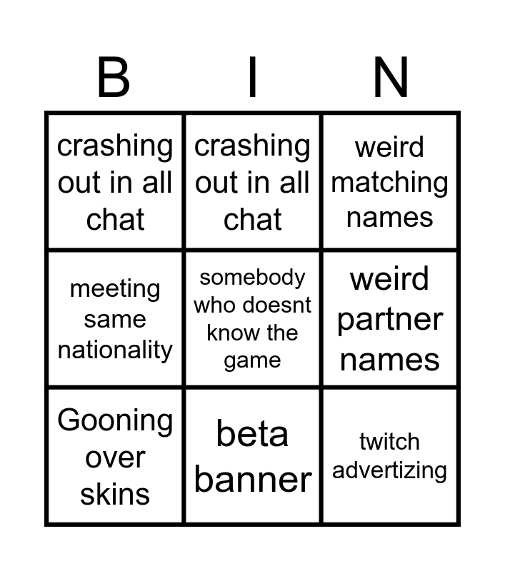This bingo card has a free space and 11 words: Gooning over skins, carrying, twitch advertizing, meeting same nationality, weird partner names, crashing out in all chat, beta banner, lineup user, crashing out in all chat, weird matching names and twitch advertising.