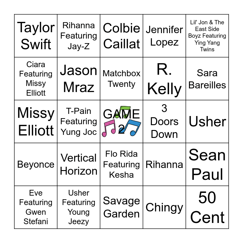 This bingo card has a free space and 50 words: Alicia Keys, 50 Cent, Timbaland Featuring Keri Hilson & D.O.E., Savage Garden, Vertical Horizon, Daniel Powter, Rihanna Featuring Jay-Z, The Fray, Ciara Featuring Missy Elliott, Justin Timberlake, Jason Mraz, Jennifer Lopez, Sean Paul, Rihanna, Janet Jackson, Katy Perry, Matchbox Twenty, 3 Doors Down, Katy Perry, Lil' Jon & The East Side Boyz Featuring Ying Yang Twins, T-Pain Featuring Yung Joc, Chingy, Taylor Swift, R. Kelly, Joe, Akon Featuring Eminem, Sara Bareilles, Matchbox Twenty, Colbie Caillat, Flo Rida Featuring Kesha, Shaggy, Ja Rule Featuring Ashanti, Avril Lavigne, Black Eyed Peas, Usher Featuring Young Jeezy, James Blunt, Ludacris Featuring Shawnna, Beyonce Featuring Slim Thug, Nickelback, Usher, Kanye West, Pink, Chris Brown Featuring T-Pain, Avril Lavigne, Eve Featuring Gwen Stefani, Missy Elliott, Plain White T's, Aaliyah, Beyonce and Chris Brown.