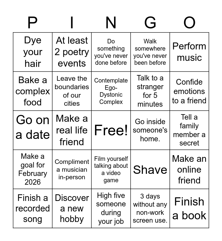 This bingo card has a free space and 24 words: Compliment a musician in-person, Discover a new hobby, Contemplate Ego-Dystonic Complex, Finish a recorded song, Perform music, Dye your hair, Bake a complex food, At least 2 poetry events, Go inside someone's home., Film yourself talking about a video game, Talk to a stranger for 5 minutes, Go on a date, Shave, Make an online friend, Leave the boundaries of our cities, 3 days without any non-work screen use., Tell a family member a secret, Do something you've never done before, Confide emotions to a friend, Make a real life friend, Finish a book, Make a goal for February 2026, Walk somewhere you've never been before and High five someone during your job.