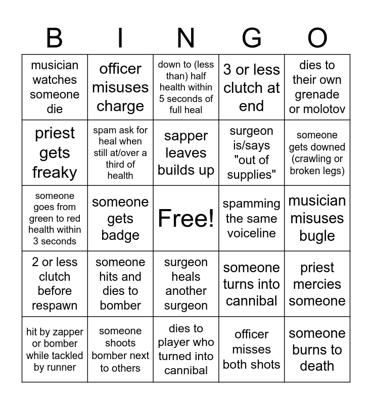 This bingo card has a free space and 24 words: someone hits and dies to bomber, someone shoots bomber next to others, sapper leaves builds up, hit by zapper or bomber while tackled by runner, dies to their own grenade or molotov, musician watches someone die, priest gets freaky, officer misuses charge, spamming the same voiceline, surgeon heals another surgeon, surgeon is/says "out of supplies", someone goes from green to red health within 3 seconds, someone turns into cannibal, priest mercies someone, spam ask for heal when still at/over a third of health, officer misses both shots, musician misuses bugle, down to (less than) half health within 5 seconds of full heal, someone gets downed (crawling or broken legs), someone gets badge, someone burns to death, 2 or less clutch before respawn, 3 or less clutch at end and dies to player who turned into cannibal.