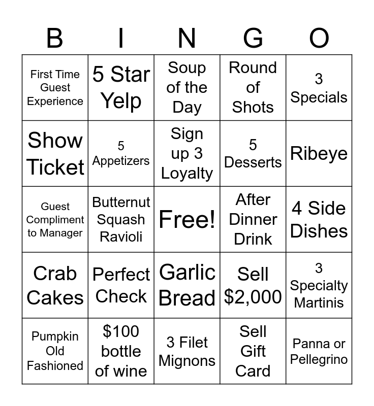 This bingo card has a free space and 24 words: Perfect Check, $100 bottle of wine, Sign up 3 Loyalty, Pumpkin Old Fashioned, 3 Specials, First Time Guest Experience, Show Ticket, 5 Star Yelp, After Dinner Drink, Garlic Bread, 5 Desserts, Guest Compliment to Manager, Sell $2,000, 3 Specialty Martinis, 5 Appetizers, Sell Gift Card, 4 Side Dishes, Soup of the Day, Ribeye, Butternut Squash Ravioli, Panna or Pellegrino, Crab Cakes, Round of Shots and 3 Filet Mignons.