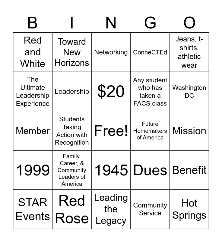 This bingo card has a free space and 24 words: Family, Career, & Community Leaders of America, Red Rose, $20, STAR Events, Jeans, t-shirts, athletic wear, Red and White, The Ultimate Leadership Experience, Toward New Horizons, Future Homemakers of America, 1945, Any student who has taken a FACS class, Member, Dues, Benefit, Leadership, Community Service, Mission, Networking, Washington DC, Students Taking Action with Recognition, Hot Springs, 1999, ConneCTEd and Leading the Legacy.