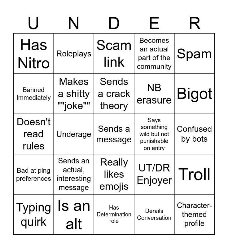 This bingo card has a free space and 24 words: Sends an actual, interesting message, Is an alt, Sends a crack theory, Typing quirk, Spam, Has Nitro, Banned Immediately, Roleplays, Says something wild but not punishable on entry, Really likes emojis, NB erasure, Doesn't read rules, UT/DR Enjoyer, Troll, Makes a shitty ""joke"", Derails Conversation, Confused by bots, Scam link, Bigot, Underage, Character-themed profile, Bad at ping preferences, Becomes an actual part of the community and Has Determination role.