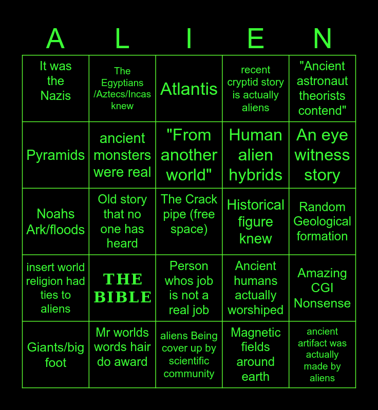 This bingo card has a free space and 24 words: 𝐓𝐇𝐄 𝐁𝐈𝐁𝐋𝐄, Mr worlds words hair do award, "From another world", Giants/big foot, "Ancient astronaut theorists contend", It was the Nazis, Pyramids, The Egyptians /Aztecs/Incas knew, Historical figure knew, Person whos job is not a real job, Human alien hybrids, Noahs Ark/floods, Ancient humans actually worshiped, Amazing CGI Nonsense, ancient monsters were real, Magnetic fields around earth, Random Geological formation, Atlantis, An eye witness story, Old story that no one has heard, ancient artifact was actually made by aliens, insert world religion had ties to aliens, recent cryptid story is actually aliens and aliens Being cover up by scientific community.