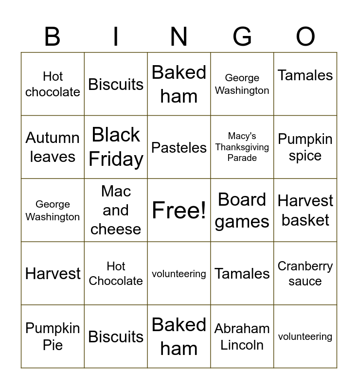 This bingo card has a free space and 59 words: Post- meal nap, Biscuits, Leftovers, Harvest, Abraham Lincoln, Turkey Trots, Black Friday, Pumpkins, Macy's Thanksgiving Parade, Pumpkin Spice, George Washington, Mac and cheese, Autumn leaves, Harvest basket, Turkey, Hot chocolate, volunteering, Tamales, Corn, Pasteles, Board games, Baked ham, Pumpkin Pie, Cranberry sauce, New England, Family, Coquito, Travel delays, Pumpkin spice, Parade, Apple Pie, Pecan Pie, Rolls, Sweet Corn, Biscuits, Scarecrow, Franklin D. Roosevelt, Mac and cheese, Storytelling, George Washington, holiday movies, Hot Chocolate, Harvest basket, Pumpkin patch, Fireplace, Cozy Socks, Turkey drumstick, Roasted vegetables, volunteering, Baked ham, Mayflower, autumn, Plymouth Rock, Black Friday deals, Maple syrup, Tamales, Autumn wreath, Gratitude Circle and Apple Crumble.