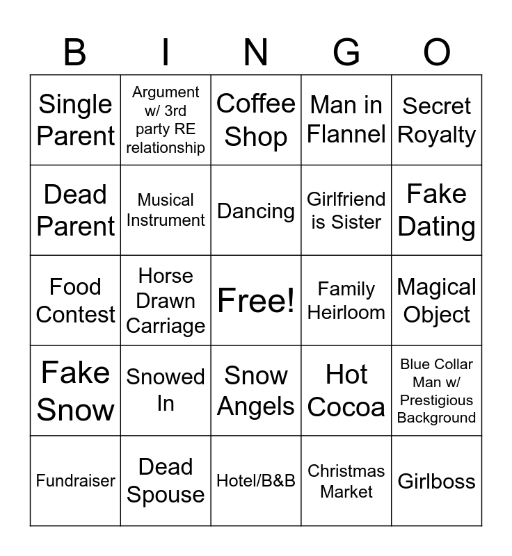 This bingo card has a free space and 54 words: Precocious Child, Fake Snow, Gay Best Friend, Falling in Snow, Snow Angels, Real Santa, Man in Flannel, Man Can Cook, Dead Parent, Raised by Grandparents, Single Parent, Baking/Decorating Cookies, Dead Spouse, Fundraiser, Save the Business, Hotel/B&B, Girlboss, Girlfriend is Sister, Enemies to Lovers, Magical Object, Hot Cocoa, Gingerbread House, Family Heirloom, Secret Royalty, Feigned Disinterest, Argument w/ 3rd party RE relationship, Dog, Decorating Tree, Christmas Tree Shopping, Christmas Market, Deadline, Big City Girl, Resistance to Outsiders, Meddling Old Person, Coffee Shop, Bakery, Food Contest, Blue Collar Man w/ Prestigious Background, MC Goes Home for Christmas, Musical Instrument, Snowball Fight, Sharing a Jacket/Scarf, Change of Heart, Secret, Snowed In, Interrupted Kiss, Misunderstanding, MCs collide, Dancing, Horse Drawn Carriage, Fake Dating, Burnt Food, Musical Montage and Small vs. Big Biz.