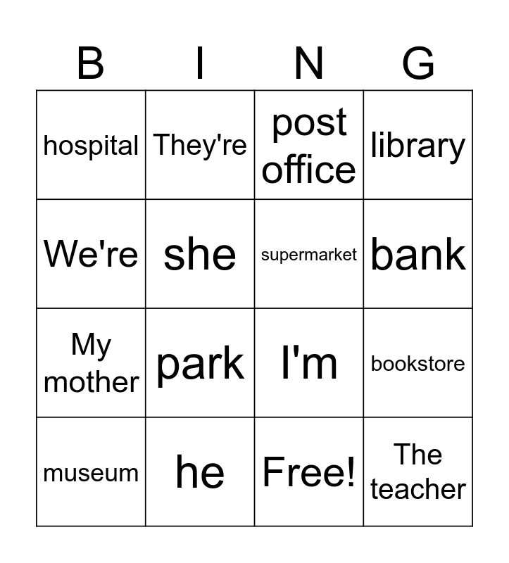 This bingo card has 17 words: Free!, museum, post office, hospital, park, library, bookstore, supermarket, bank, she, he, I'm, We're, They're, My mother, My friend and The teacher.