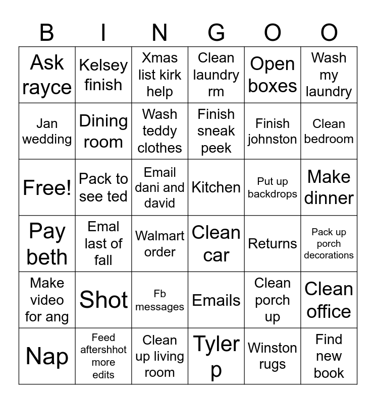 This bingo card has 36 words: Emails, Fb messages, Tyler p, Jan wedding, Pay beth, Kitchen, Dining room, Clean up living room, Open boxes, Clean porch up, Clean bedroom, Clean laundry rm, Clean office, Pack to see ted, Finish sneak peek, Ask rayce, Make video for ang, Put up backdrops, Free!, Xmas list kirk help, Email dani and david, Emal last of fall, Clean car, Walmart order, Returns, Kelsey finish, Finish johnston, Feed aftershhot more edits, Wash teddy clothes, Wash my laundry, Find new book, Nap, Pack up porch decorations, Make dinner, Shot and Winston rugs.