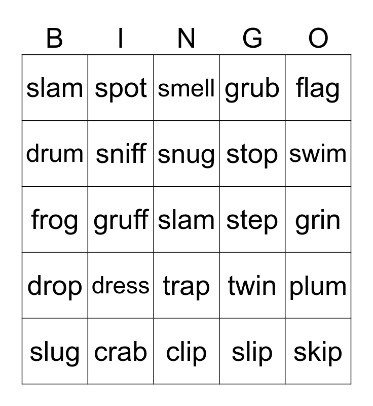 This bingo card has a free space and 30 words: crab, grab, gruff, plan, slam, smell, sniff, trap, step, clip, grin, skip, slip, swill, swim, trip, twin, drop, dress, flag, frog, flop, spot, stop, drum, grub, plum, slug, snug and snuff.