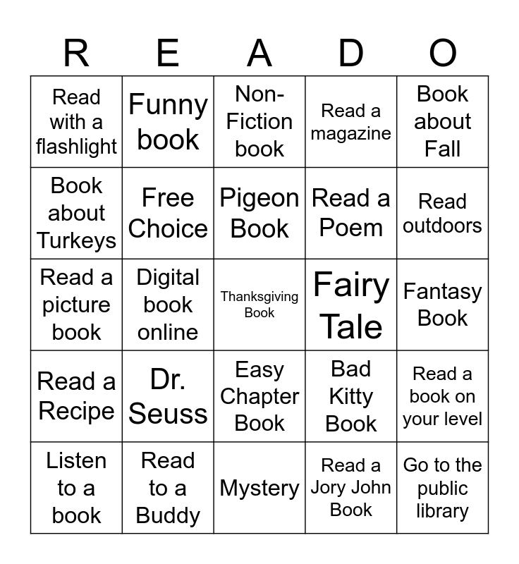 This bingo card has 25 words: Dr. Seuss, Mystery, Pigeon Book, Listen to a book, Book about Fall, Read with a flashlight, Book about Turkeys, Funny book, Fairy Tale, Easy Chapter Book, Read a Poem, Read a picture book, Bad Kitty Book, Read a book on your level, Free Choice, Go to the public library, Fantasy Book, Non-Fiction book, Read outdoors, Digital book online, Thanksgiving Book, Read to a Buddy, Read a Recipe, Read a magazine and Read a Jory John Book.