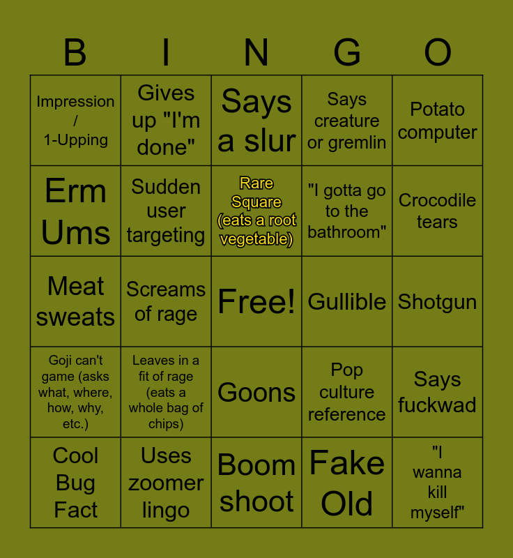 This bingo card has a free space and 24 words: Leaves in a fit of rage (eats a whole bag of chips), Uses zoomer lingo, Rare Square (eats a root vegetable), Cool Bug Fact, Potato computer, Impression / 1-Upping, Erm Ums, Gives up "I'm done", Gullible, Goons, "I gotta go to the bathroom", Meat sweats, Pop culture reference, Says fuckwad, Sudden user targeting, Fake Old, Shotgun, Says a slur, Crocodile tears, Screams of rage, "I wanna kill myself", Goji can't game (asks what, where, how, why, etc.), Says creature or gremlin and Boom shoot.
