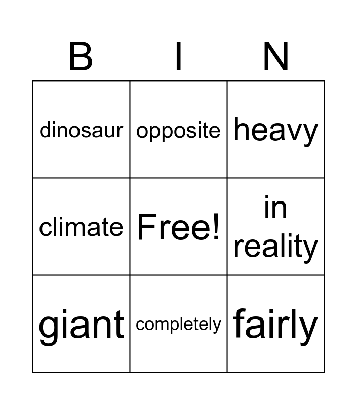This bingo card has a free space and 11 words: hunter, completely, fairly, giant, opposite, heavy, in reality, probably, climate, dinosaur and relative.