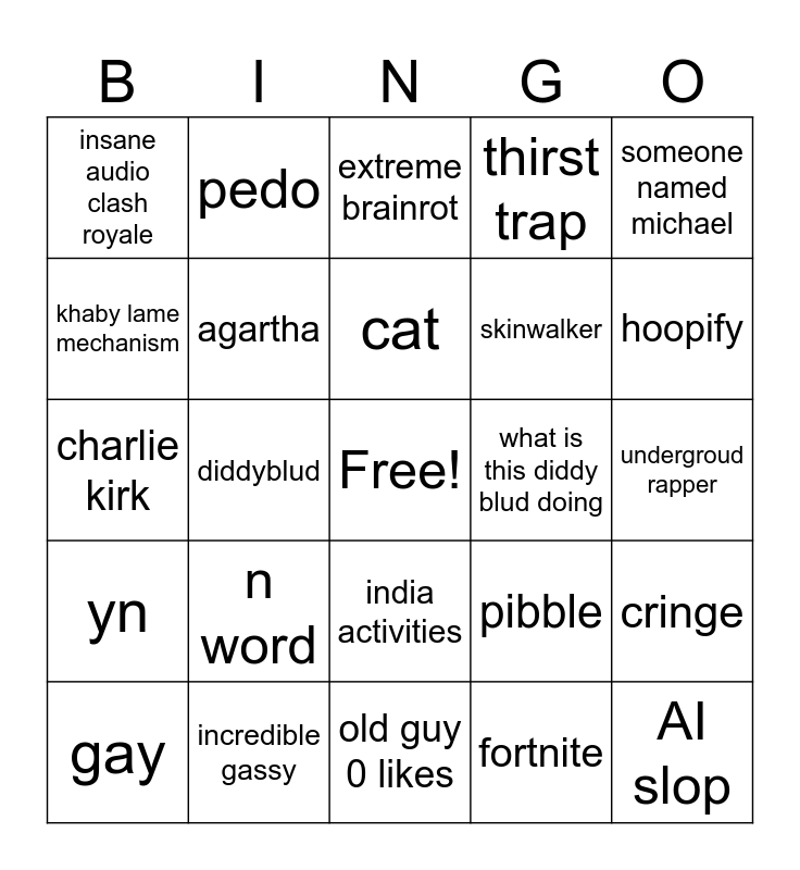 This bingo card has a free space and 24 words: gay, n word, cat, fortnite, someone named michael, insane audio clash royale, pedo, extreme brainrot, what is this diddy blud doing, undergroud rapper, charlie kirk, agartha, pibble, cringe, khaby lame mechanism, incredible gassy, old guy 0 likes, thirst trap, hoopify, yn, diddyblud, india activities, skinwalker and AI slop.