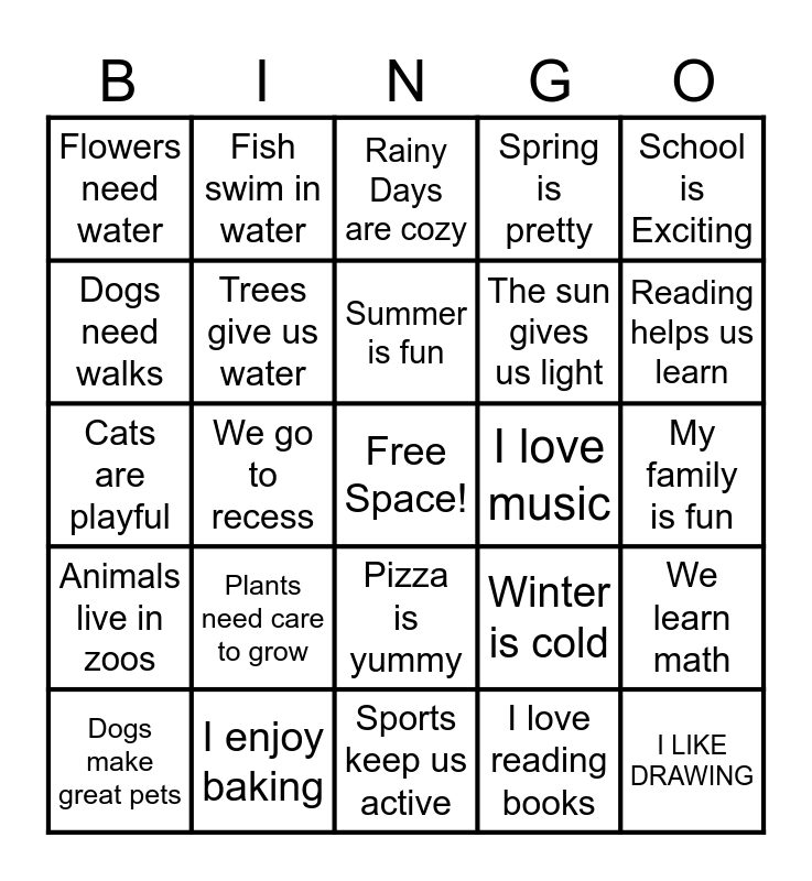 This bingo card has a free space and 24 words: Dogs make great pets, Plants need care to grow, Summer is fun, I love reading books, School is Exciting, Flowers need water, Fish swim in water, Rainy Days are cozy, I love music, My family is fun, Cats are playful, Trees give us water, Winter is cold, We learn math, Dogs need walks, I enjoy baking, Sports keep us active, Spring is pretty, Reading helps us learn, Animals live in zoos, We go to recess, Pizza is yummy, The sun gives us light and I LIKE DRAWING.