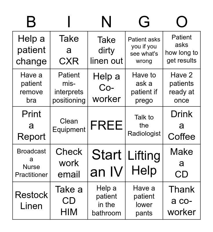 This bingo card has a free space and 24 words: Restock Linen, Check work email, Help a Co-worker, Have a patient lower pants, Patient asks how long to get results, Help a patient change, Take a CXR, Take dirty linen out, Talk to the Radiologist, Drink a Coffee, Print a Report, Patient mis-interprets positioning, Lifting Help, Make a CD, Have a patient remove bra, Take a CD HIM, Help a patient in the bathroom, Patient asks you if you see what's wrong, Have 2 patients ready at once, Broadcast a Nurse Practitioner, Clean Equipment, Start an IV, Have to ask a patient if prego and Thank a co-worker.