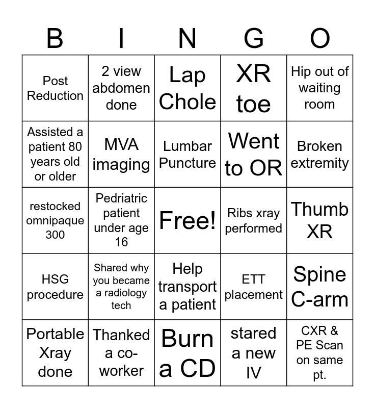 This bingo card has a free space and 24 words: Portable Xray done, Shared why you became a radiology tech, Lumbar Puncture, stared a new IV, Hip out of waiting room, Post Reduction, 2 view abdomen done, Lap Chole, Ribs xray performed, Thumb XR, restocked omnipaque 300, MVA imaging, ETT placement, Spine C-arm, Assisted a patient 80 years old or older, Thanked a co-worker, Burn a CD, XR toe, Broken extremity, HSG procedure, Pedriatric patient under age 16, Help transport a patient, Went to OR and CXR & PE Scan on same pt..