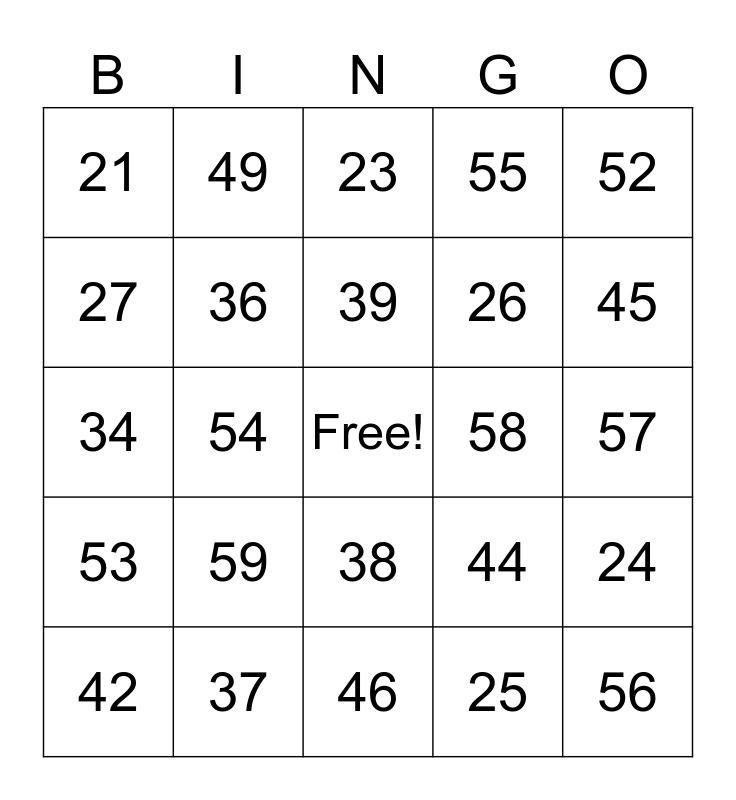 This bingo card has a free space and 40 words: 33, 34, 35, 36, 37, 38, 39, 51, 52, 53, 54, 55, 56, 57, 58, 59, 20, 21, 22, 23, 24, 25, 26, 27, 28, 29, 30, 31, 32, 40, 41, 42, 43, 44, 45, 46, 47, 48, 49 and 60.