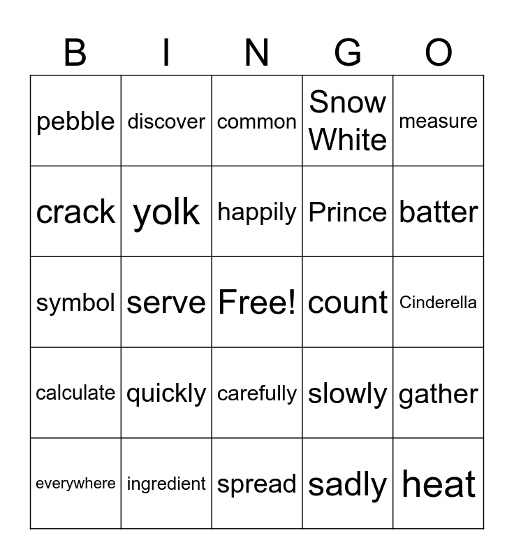 This bingo card has a free space and 24 words: quickly, ingredient, happily, everywhere, measure, pebble, crack, discover, count, carefully, Prince, symbol, slowly, gather, yolk, sadly, Cinderella, common, batter, serve, heat, calculate, Snow White and spread.