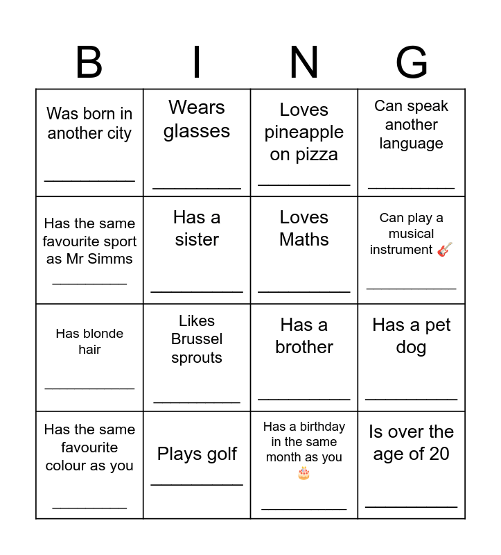 This bingo card has 20 words: Has a pet dog _________, Has been on a plane _________, Loves pineapple on pizza _________, Can whistle _________, Has the same favourite colour as you _________, Has the same favourite sport as Mr Simms _________, Plays golf _________, Was born in another city __________, Has blonde hair ____________, Wears glasses ________, Likes Brussel sprouts __________, Has a brother _________, Has a sister _________, Is over the age of 20 _________, Loves Maths _________, Has read more than 5 books this year _________, Can play a musical instrument 🎸 ____________, Can speak another language __________, Has a birthday in the same month as you 🎂 ____________ and Can name all the planets in the solar system 🌏 _____________.