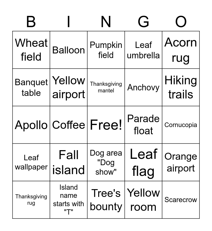 This bingo card has a free space and 24 words: Fall island, Island name starts with "T", Thanksgiving mantel, Thanksgiving rug, Acorn rug, Wheat field, Banquet table, Balloon, Parade float, Dog area "Dog show", Anchovy, Apollo, Leaf flag, Orange airport, Yellow airport, Yellow room, Cornucopia, Pumpkin field, Hiking trails, Coffee, Scarecrow, Leaf wallpaper, Leaf umbrella and Tree's bounty.