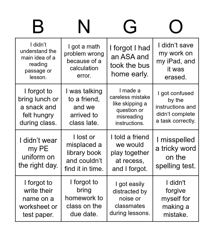 This bingo card has 16 words: I forgot to bring homework to class on the due date., I misspelled a tricky word on the spelling test., I forgot I had an ASA and took the bus home early., I didn’t understand the main idea of a reading passage or lesson., I didn’t wear my PE uniform on the right day., I got a math problem wrong because of a calculation error., I told a friend we would play together at recess, and I forgot., I got easily distracted by noise or classmates during lessons., I forgot to bring lunch or a snack and felt hungry during class., I was talking to a friend, and we arrived to class late., I forgot to write their name on a worksheet or test paper., I didn’t save my work on my iPad, and it was erased., I lost or misplaced a library book and couldn’t find it in time., I got confused by the instructions and didn’t complete a task correctly., I made a careless mistake like skipping a question or misreading instructions. and I didn't forgive myself for making a mistake..