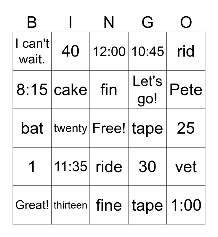 This bingo card has a free space and 24 words: 11:35, thirteen, fin, Great!, rid, I can't wait., 8:15, 40, tape, ride, Let's go!, bat, 30, vet, cake, tape, 25, 12:00, Pete, twenty, 1:00, 1, 10:45 and fine.