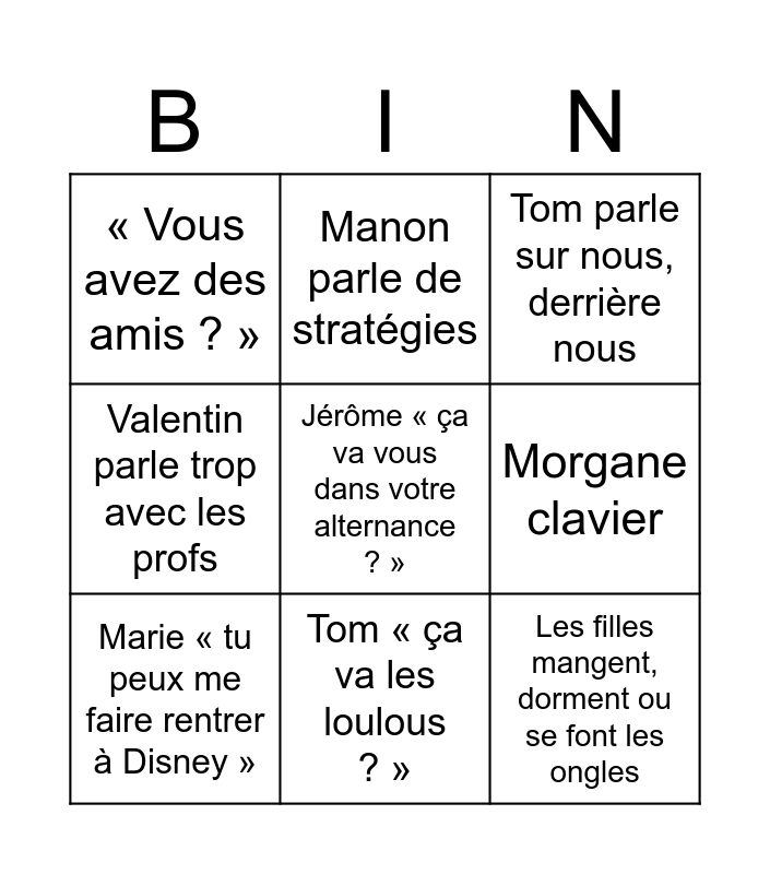 This bingo card has a free space and 9 words: Marie « tu peux me faire rentrer à Disney », Tom parle sur nous, derrière nous, Manon parle de stratégies, Valentin parle trop avec les profs, « Vous avez des amis ? », Morgane clavier, Les filles mangent, dorment ou se font les ongles, « Maëva t’a pas fait à manger à Soren ? » and Tom « ça va les loulous ? ».