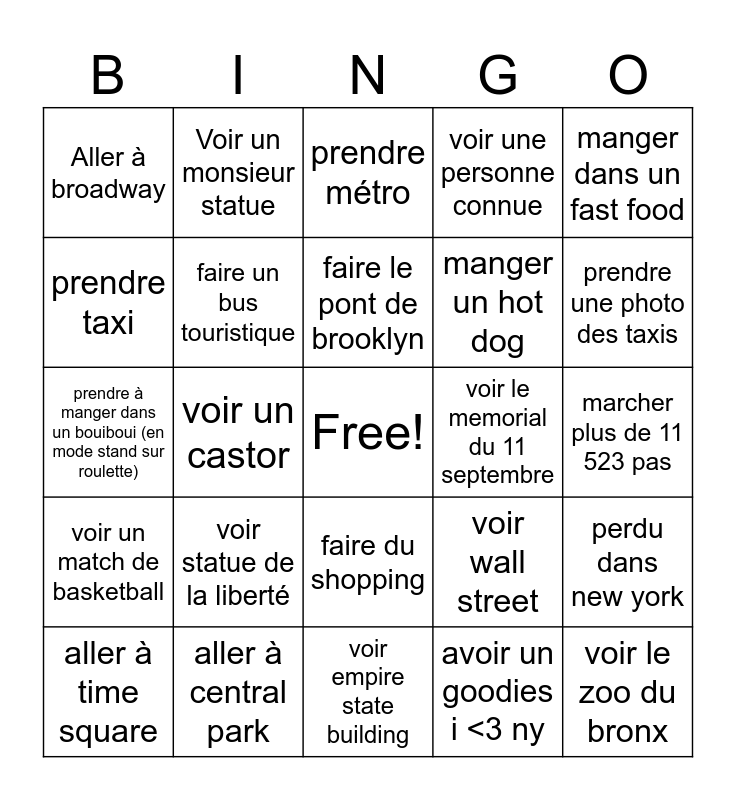 This bingo card has a free space and 24 words: voir statue de la liberté, aller à central park, faire le pont de brooklyn, aller à time square, manger dans un fast food, Aller à broadway, prendre taxi, Voir un monsieur statue, voir le memorial du 11 septembre, faire du shopping, manger un hot dog, prendre à manger dans un bouiboui (en mode stand sur roulette), voir wall street, perdu dans new york, faire un bus touristique, avoir un goodies i <3 ny, marcher plus de 11 523 pas, prendre métro, prendre une photo des taxis, voir un castor, voir le zoo du bronx, voir un match de basketball, voir une personne connue and voir empire state building.