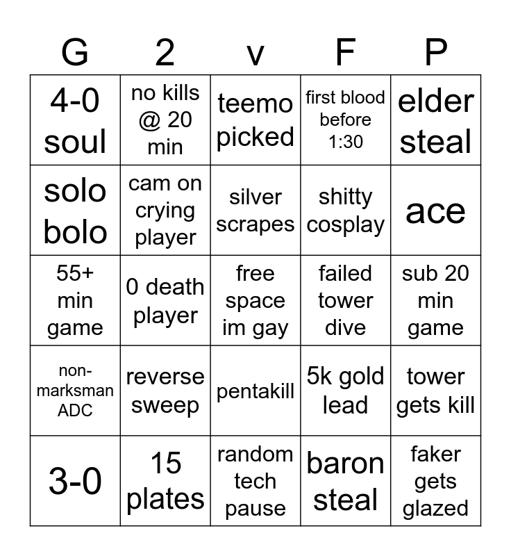 This bingo card has a free space and 24 words: 3-0, reverse sweep, silver scrapes, baron steal, elder steal, 4-0 soul, no kills @ 20 min, teemo picked, failed tower dive, sub 20 min game, 55+ min game, cam on crying player, 5k gold lead, tower gets kill, solo bolo, 15 plates, random tech pause, first blood before 1:30, ace, non-marksman ADC, 0 death player, pentakill, shitty cosplay and faker gets glazed.