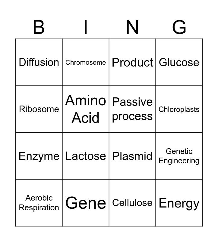 This bingo card has 24 words: Cell Membrane, Cell Wall, Chloroplasts, Nucleus, Ribosome, Diffusion, Amino Acid, Chromosome, Gene, Active Site, Enzyme, Plasmid, Specific, Genetic Code, Passive process, Cytoplasm, Cellulose, Product, Lactose, Genetic Engineering, Aerobic Respiration, Energy, Glucose and Mitochondria.