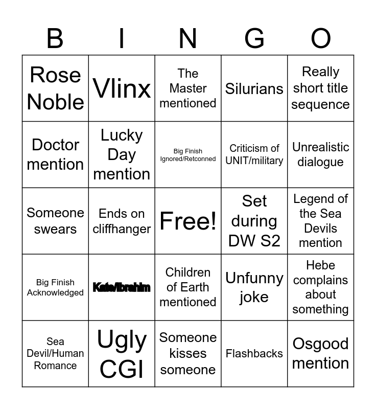 This bingo card has a free space and 24 words: Kate/Ibrahim, Ugly CGI, Big Finish Ignored/Retconned, Sea Devil/Human Romance, Really short title sequence, Rose Noble, Doctor mention, Vlinx, Set during DW S2, Children of Earth mentioned, Criticism of UNIT/military, Someone swears, Unfunny joke, Hebe complains about something, Lucky Day mention, Flashbacks, Legend of the Sea Devils mention, The Master mentioned, Unrealistic dialogue, Ends on cliffhanger, Osgood mention, Big Finish Acknowledged, Silurians and Someone kisses someone.