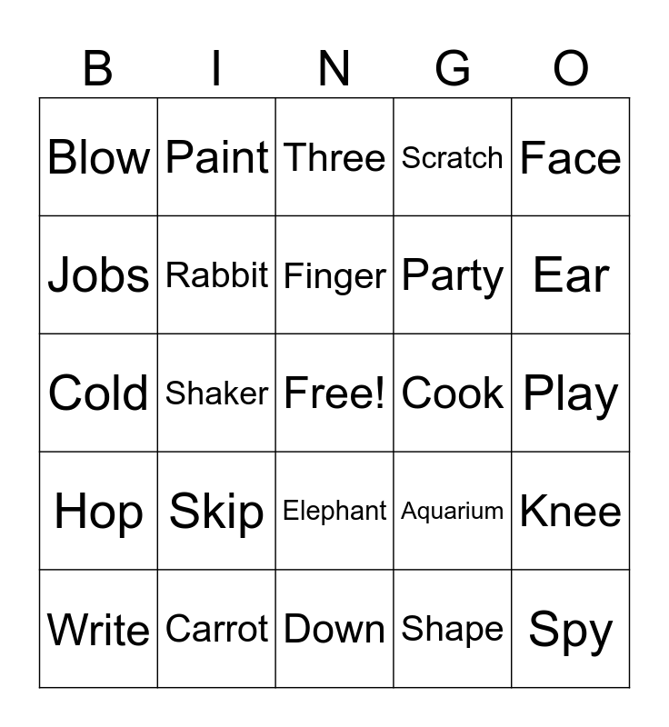 This bingo card has a free space and 39 words: School, Lunch, Shut, Rabbit, Write, Elephant, Finger, Soil, Face, Hop, Shaker, Scratch, Spy, Play, Cook, Skip, Build, Blow, Dinosaur, Aquarium, Jobs, Down, Party, Ear, Roar, Climb, Share, Cut, Hanger, Paint, Ball, Push, Three, Carrot, Shape, Digger, Knee, Cold and Bridge.
