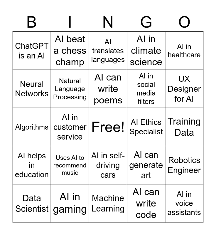 This bingo card has a free space and 25 words: Uses AI to recommend music, Machine Learning, AI can write poems, Data Scientist, AI in healthcare, ChatGPT is an AI, Neural Networks, AI beat a chess champ, AI Ethics Specialist, AI in self-driving cars, AI in social media filters, Algorithms, AI can generate art, Robotics Engineer, Natural Language Processing, AI can detect fake news, Training Data, AI translates languages, UX Designer for AI, AI in customer service, AI in voice assistants, AI in gaming, AI helps in education, AI in climate science and AI can write code.